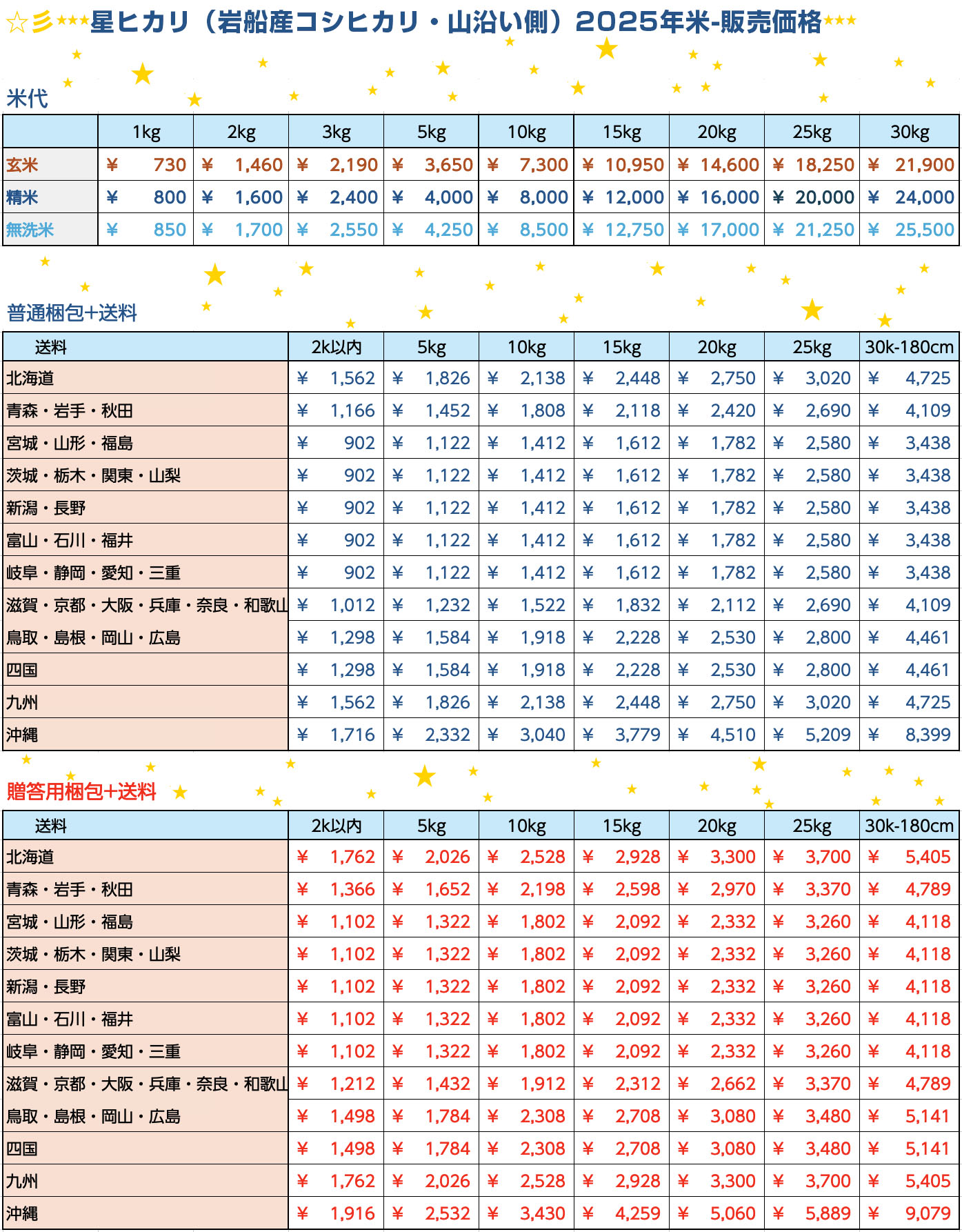 ●支払い方法は次の方法がご利用いただけます。 精米・玄米・無洗米の種別と、量、個数、住所、氏名、電話番号を明記し、Email・電話などでお申し込み下さい ●ご注意●● 梅雨期、夏期の米の保存にご注意下さい。カビや虫(蛾の幼虫)が発生する場合があります。当家では専用の保冷庫で米の保存を行っています。梅雨期〜夏期の保存にご心配でしたら、少量づつ期間を分けてご注文頂くことをおすすめ致します。 夏期に問題となる虫などの付着にはできる限りの対策を講じておりますが、発送前に何らかの理由で虫などが付着していた場合、新しいものと交換させて頂きますのでお知らせ下さい。 <岩船産コシヒカリ・生産販売> 沼澤・kome@jpll.jp 電話:0254-60-1133、0254-66-6993 FaceBook :星 ヒカリ |